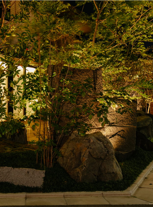 また、ウッドデッキや植栽、ライティングを巧みに取り入れ、温かみのある雰囲気を演出しています。
